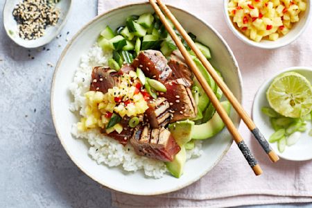 Cook the rice according to the packet instructions. Meanwhile heat a griddle pan over a high heat, brush the tuna steak with the sunflower oil and cook for a few minutes on each side, or until cooked to your liking.