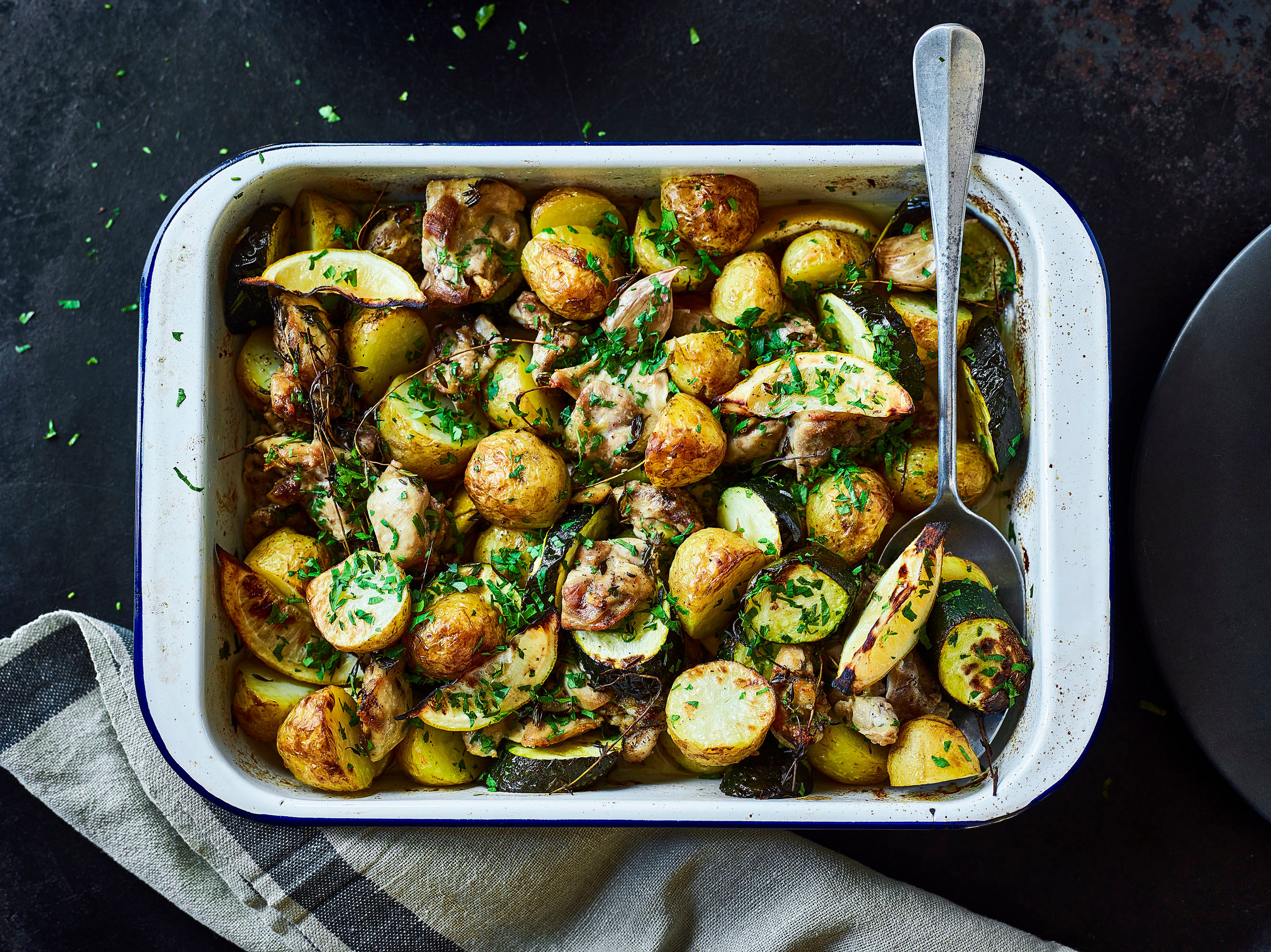 Preheat the oven to 200ºC. Bring a large pan of salted water to the boil, add the potatoes and cook for 5 minutes. Drain throughly then tip into large bowl. Add the remaining ingredients into the bowl, toss to combine then tip into a large roasting tray. Roast for 25-30 minutes, shaking the tray occasionally. Leave to cool slightly before serving.