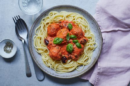 Drain the pasta, top with the meatballs and sauce, and finish with the basil leaves to serve.