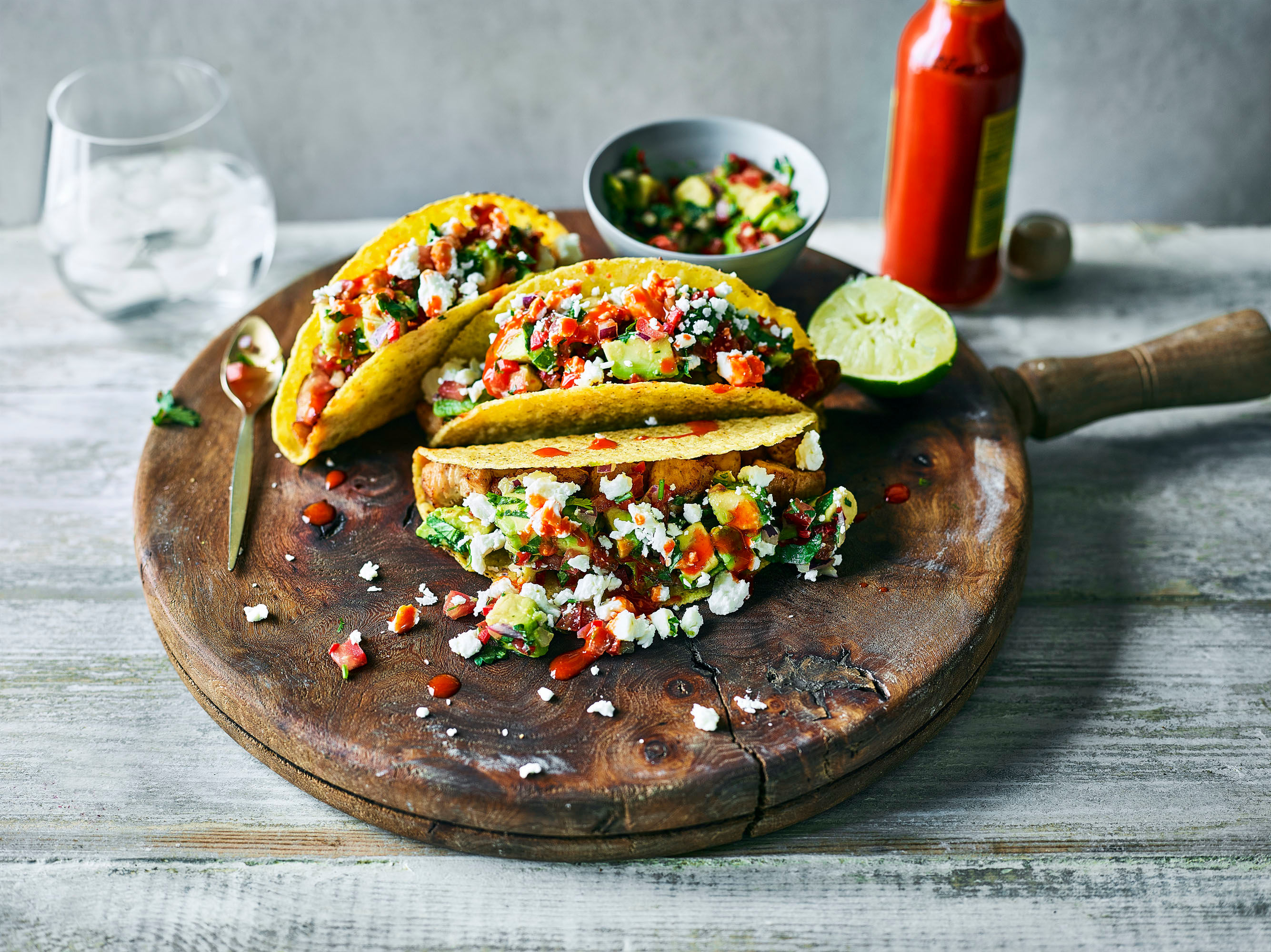 Warm the taco shells in the oven or microwave according to the packet instructions. Pile the chicken into the taco shells, top with the avocado salsa then sprinkle over the feta. Serve with hot sauce.
