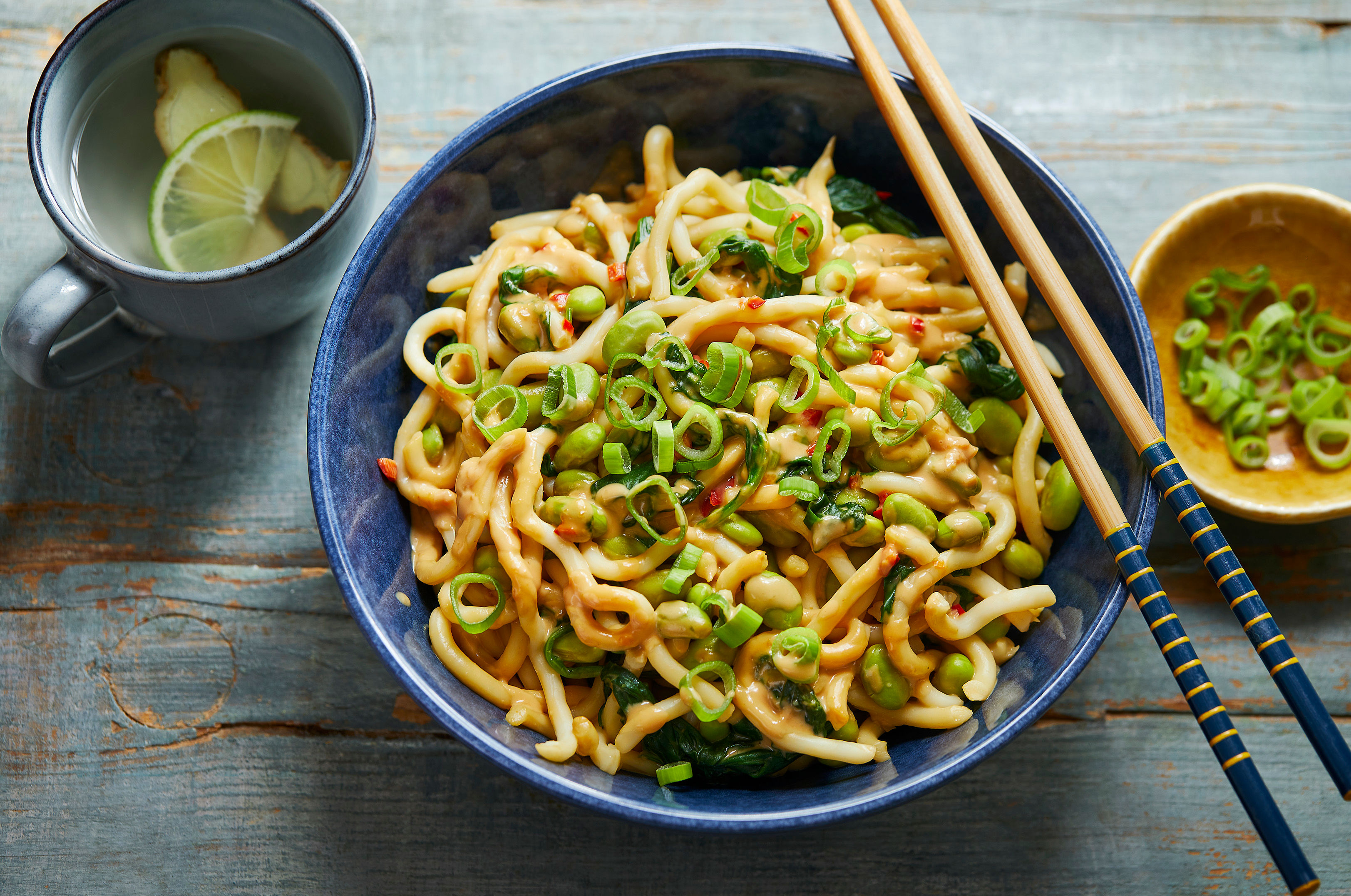 Heat a large frying pan or wok over a medium to high heat. Add the spinach along with a splash of water, cook for a few minutes before adding in the noodles. Pour in the sauce and add the edamame. Stir everything together and cook for a few minutes, or until everything is hot. Serve up and sprinkle over the spring onion.