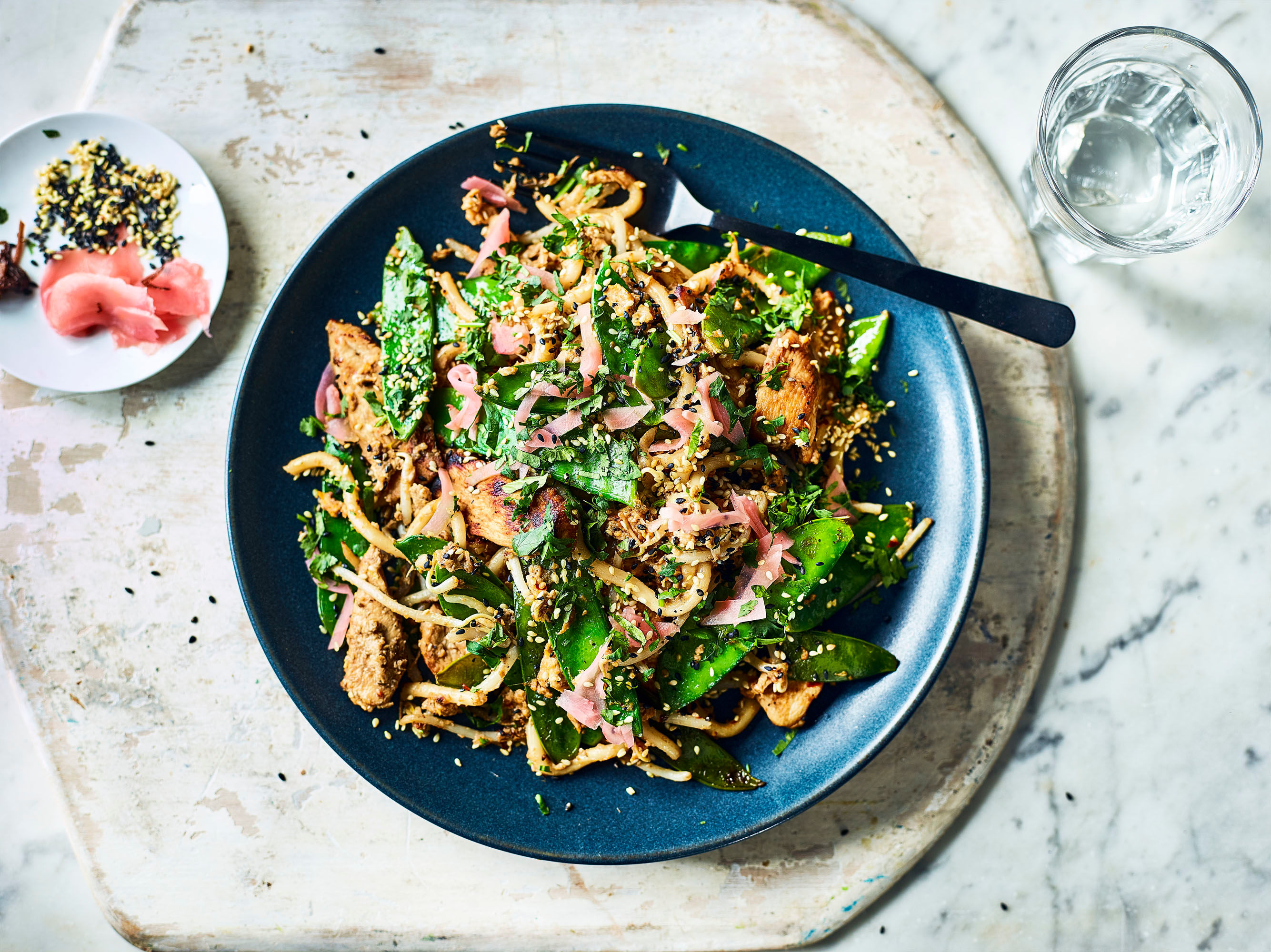 Top with the sesame seeds, coriander and pickled ginger (optional) to serve.