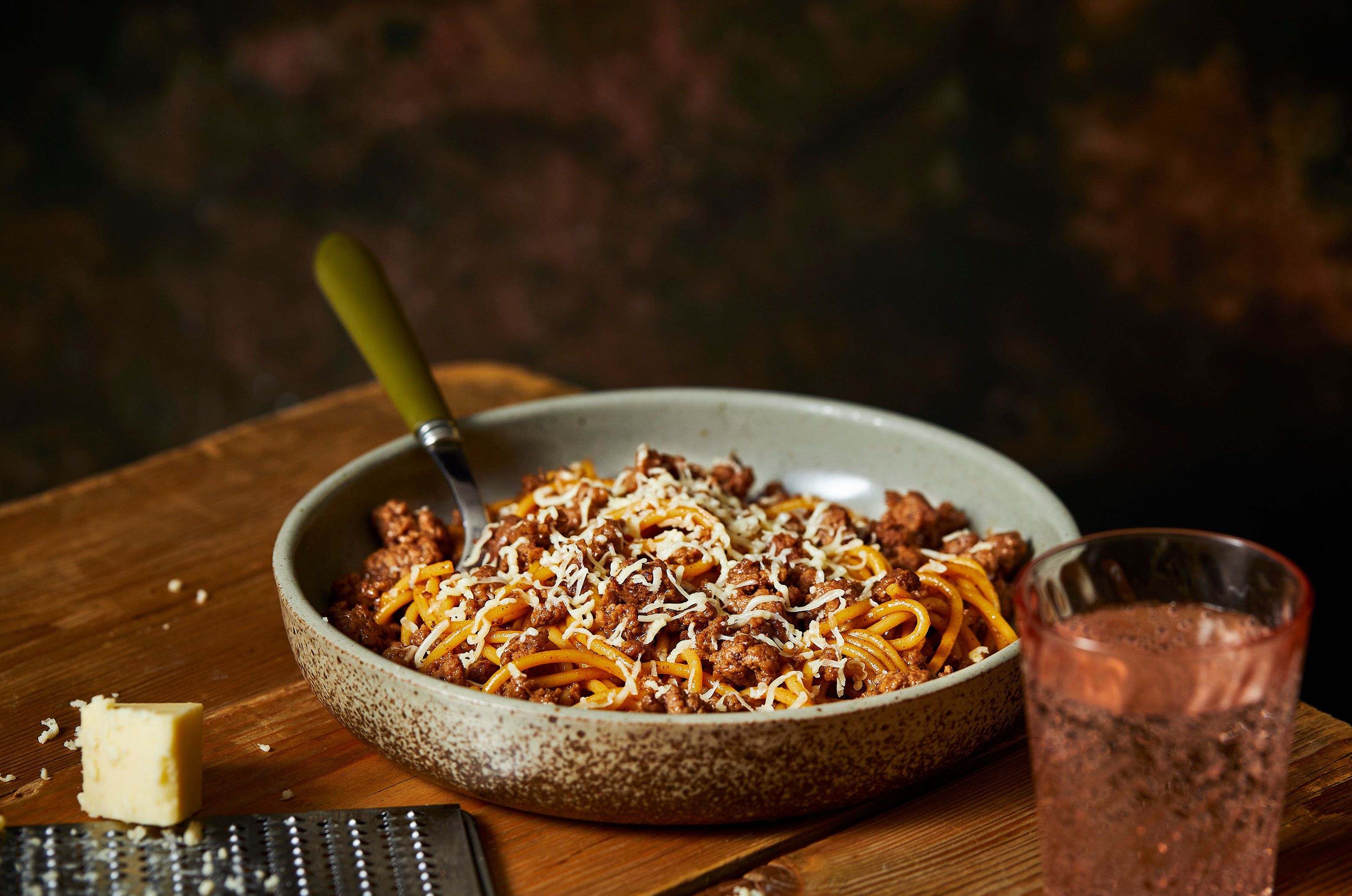 Add the pasta to the cooked mince and stir in the marmite. Add a glug of the reserved cooking water and stir the pasta well to make sure everything combines.