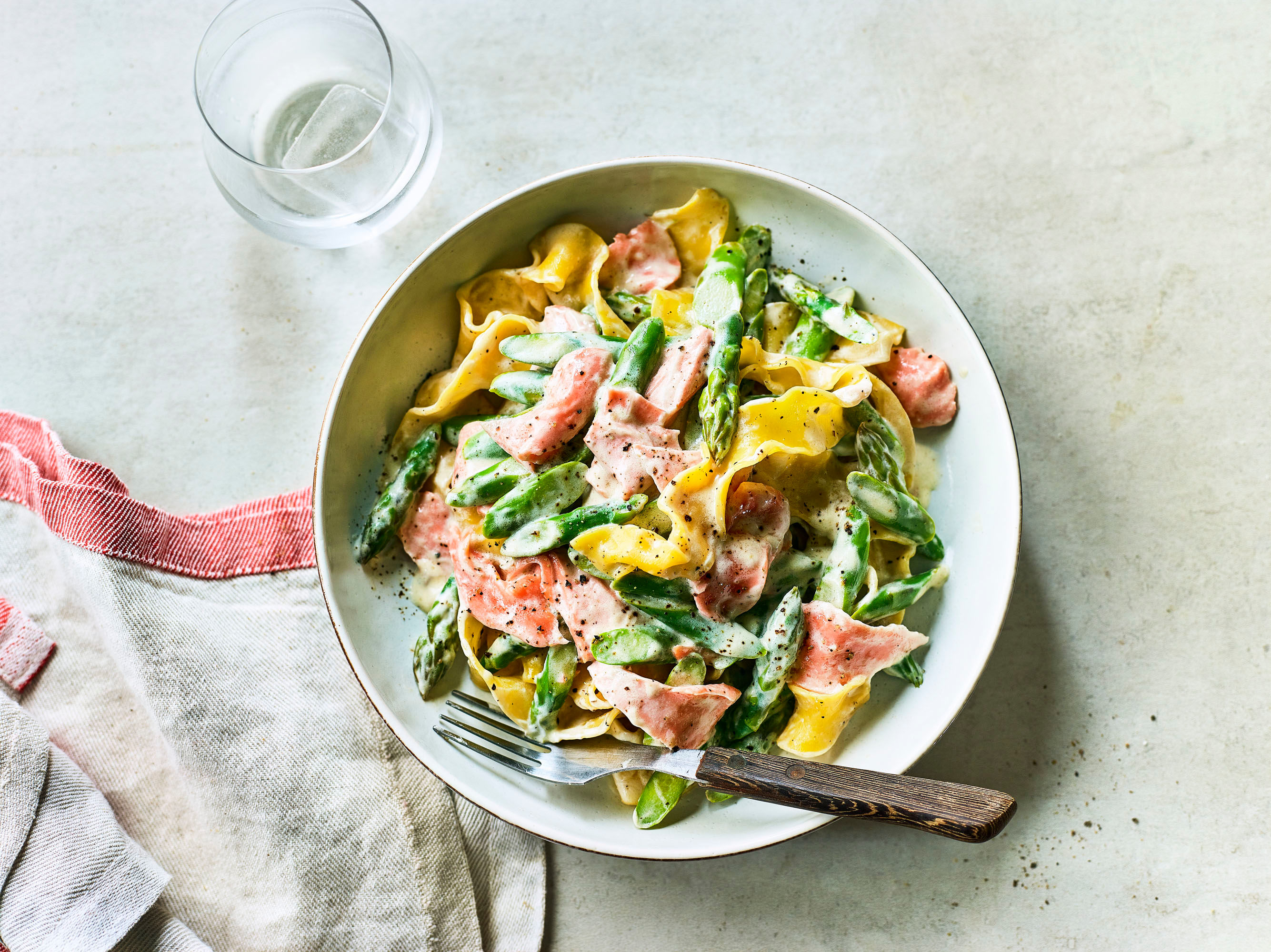Meanwhile bring a large pan of salted water to the boil. Add the pasta and cook according to the packet instructions, adding the asparagus for the final minute of cooking. Drain the pasta and asparagus, reserving a little of the cooking water.