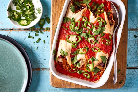 Put the chopped tomatoes, peppers and tomato purée into a liquidiser with a pinch of salt and pepper and blend until smooth. Pour one-third of the sauce into an ovenproof dish and lay the wraps on top. Pour the remaining sauce over the top then bake for 20 minutes. Remove from the oven and top with the jalapeños and coriander to serve.