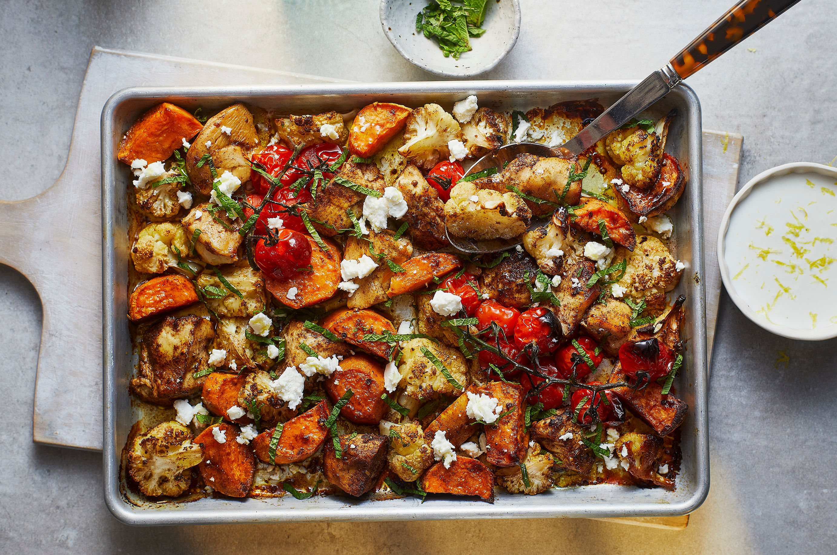Meanwhile, mix the lemon juice in with the yogurt, season with a little salt and top with the lemon zest. Serve the traybake with the lemony yogurt and scatter the chopped mint leaves and feta over the top before serving.