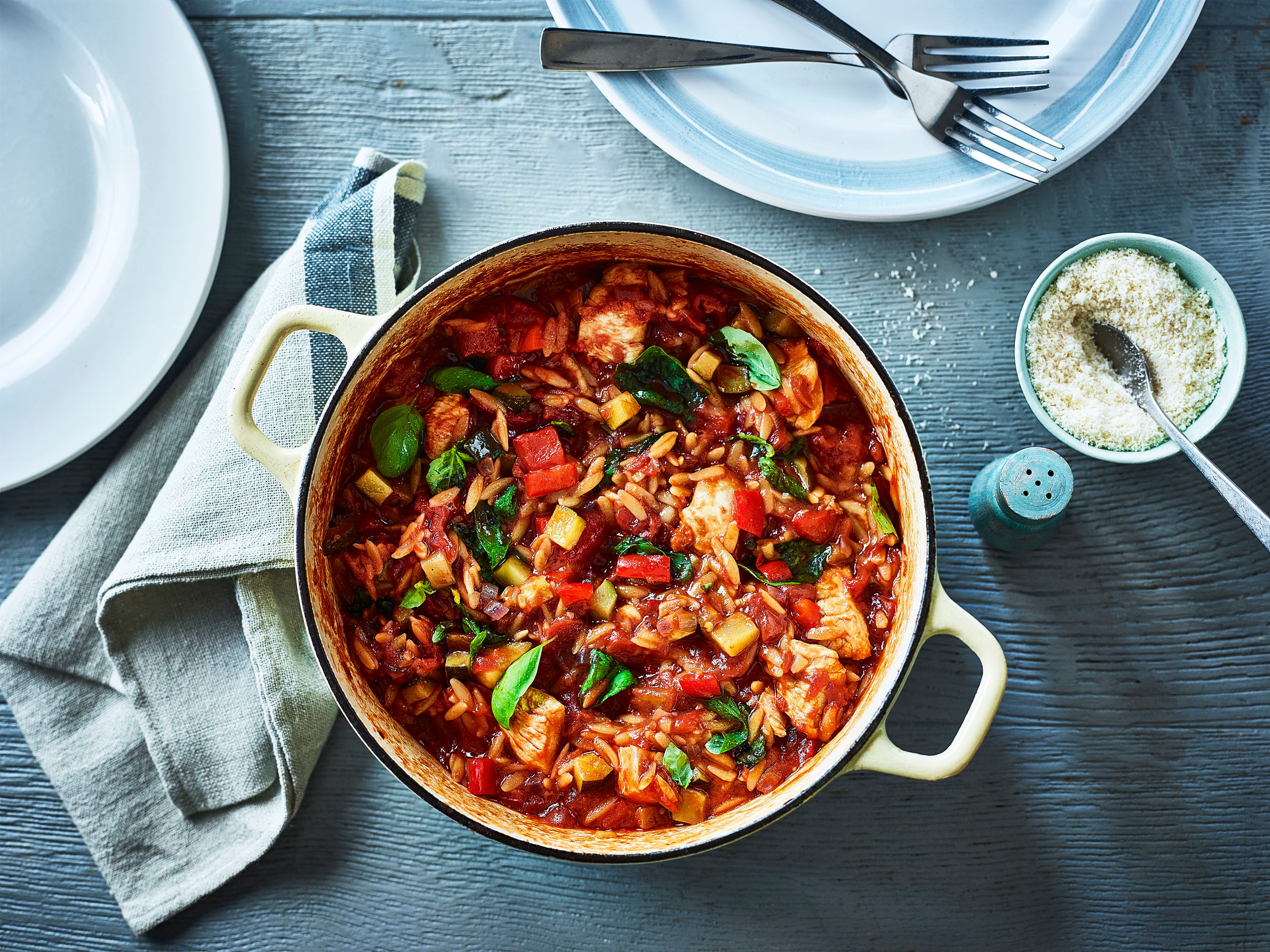 Heat the remaining oil, add the onion, pepper, courgette and chilli and fry for 5 minutes until soft. Add the garlic, fry for a minute then add the tomatoes. Stir in the chicken, orzo and the water, cover then simmer for 10 minutes until the orzo is cooked.