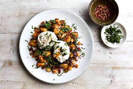 Meanwhile poach the egg in a pan of gently simmering water for 3 minutes until the white is set and the yolk is still runny, or until cooked to your liking. Top the hash with the poached egg, scatter over the coriander and serve.