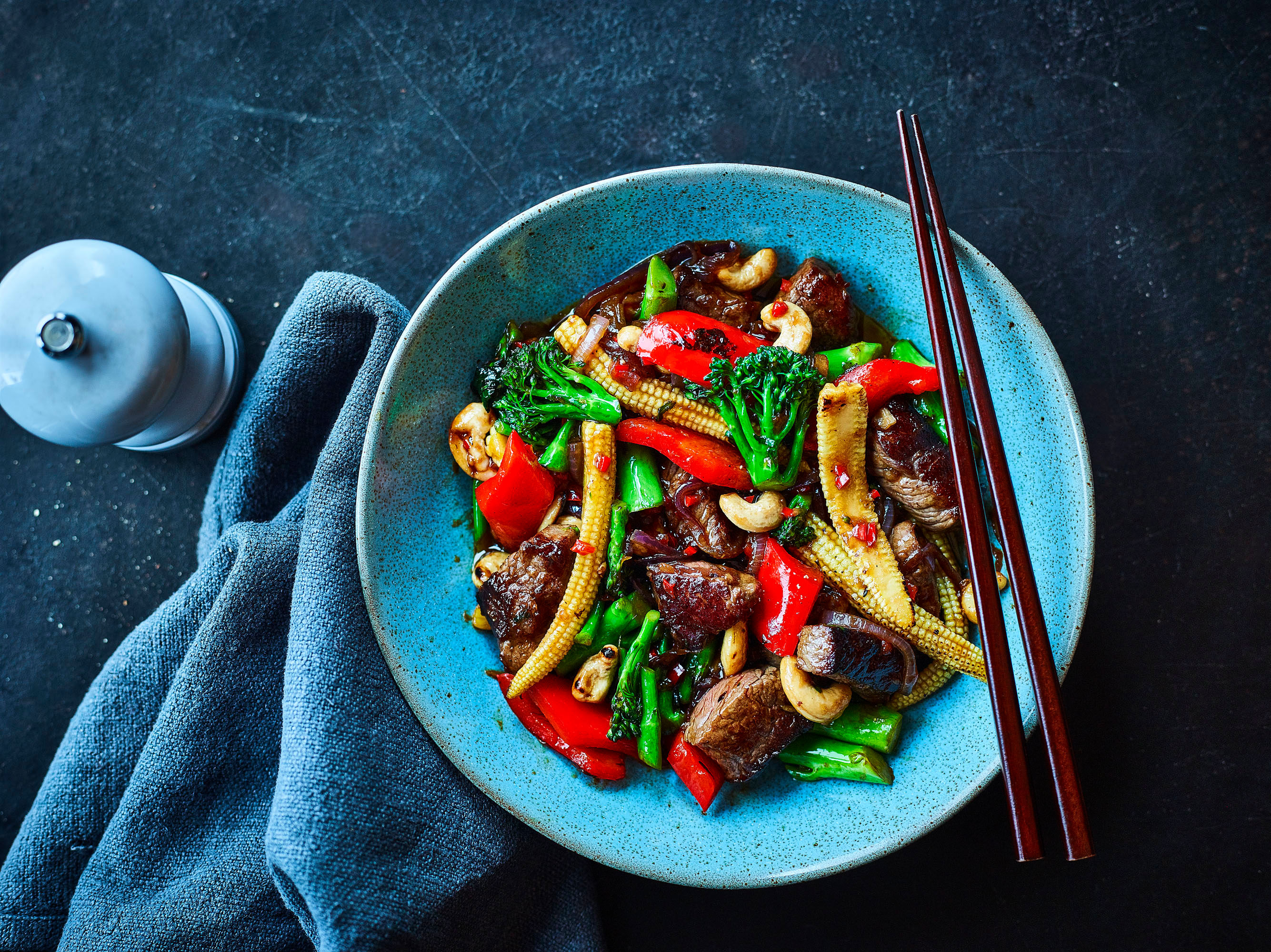 Add the onion, chilli, ginger and garlic to the pan and fry for a couple of minutes until softened. Add the remaining vegetables, fry for a couple of minutes then add a splash of water. Continue to cook for 2-3 minutes until the vegetables have softened slightly then return the steak pieces to the pan. Pour in the nuts and oyster sauce, toss everything together then serve.
