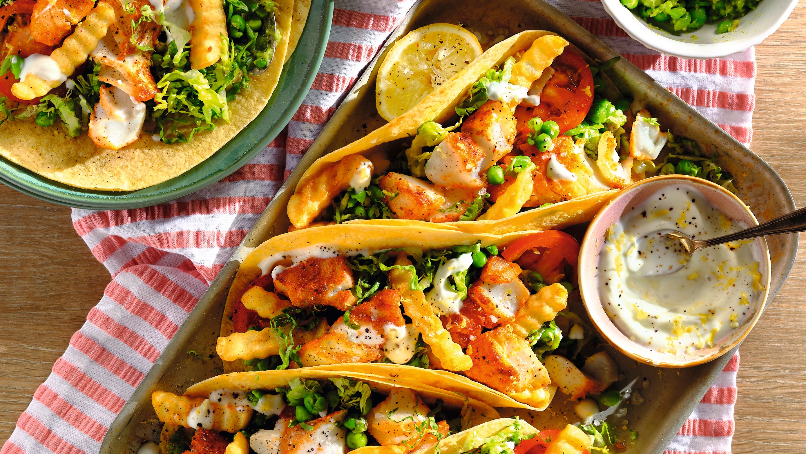 First up is our Fish & Chip Tacos, a fun twist on a takeaway favourite. We serve ours family-style at the dinner table so the kids can build their own wraps – they’re loaded with flaky cod fingers, crispy chips, smashed peas and lemony yogurt. They’re delicious!